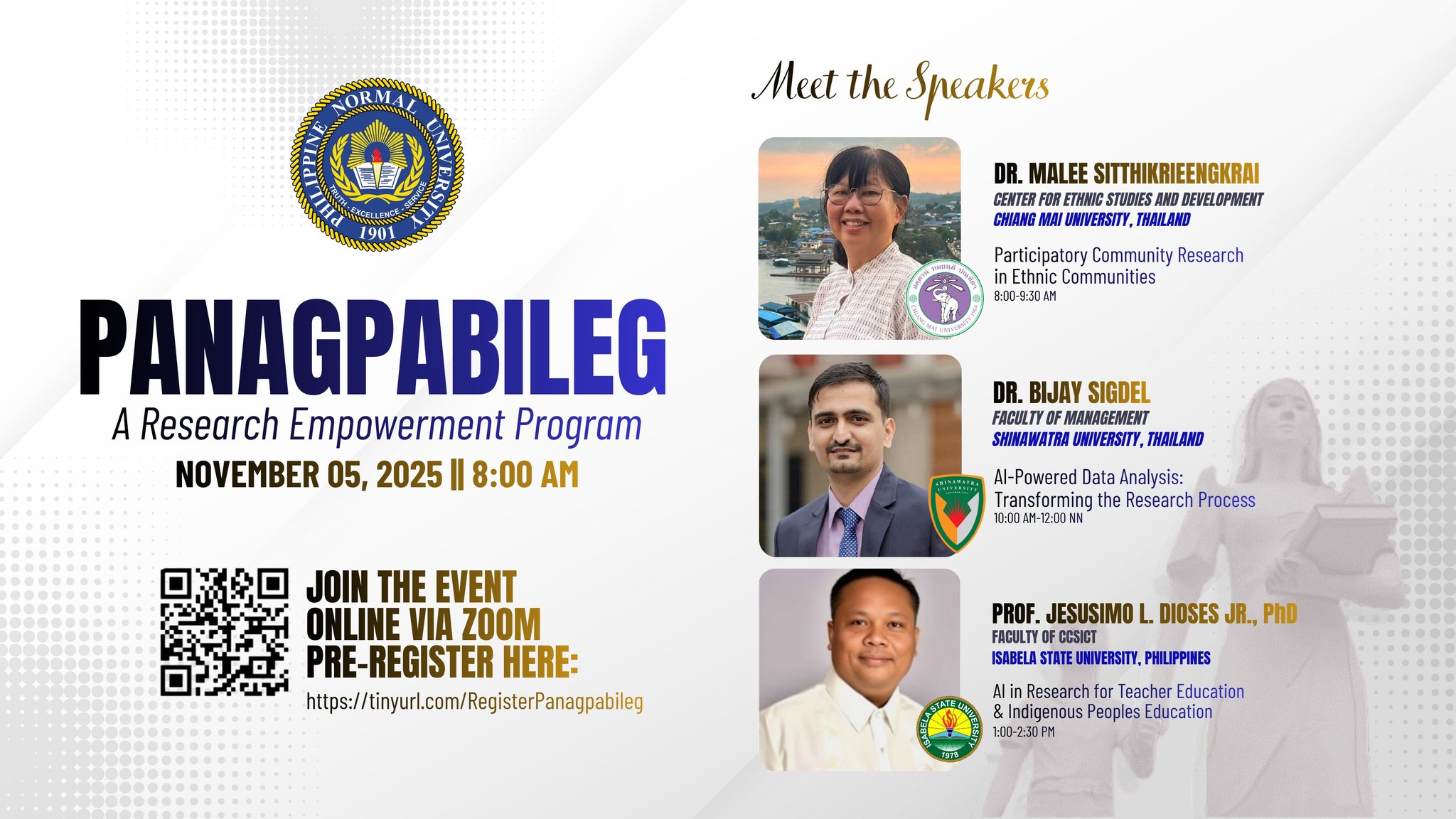 The Philippine Normal University North Luzon, through the Research and Publication Unit, invites educators, researchers, and students to the PANAGPABILEG: Research Empowerment Program on November 5, 2025. Join this hybrid event featuring distinguished international and local experts as they share insights on participatory research, artificial intelligence in data analysis, and innovations in teacher and Indigenous continue reading : PANAGPABILEG “A Research Empowerment Program” November 5, 2025