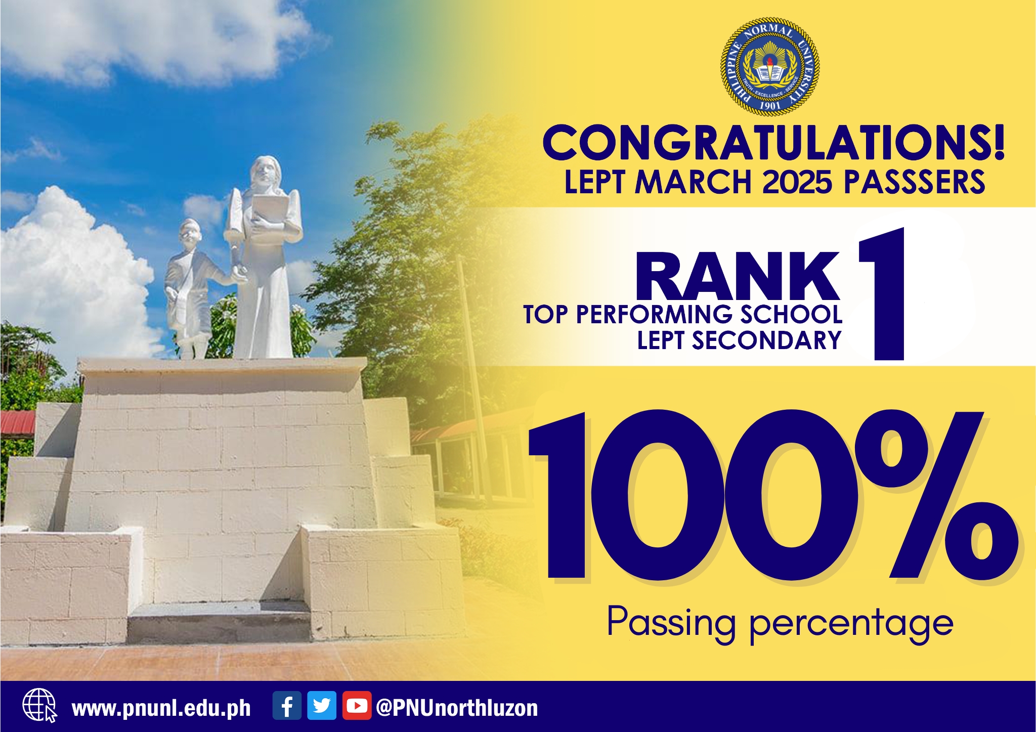 Congratulations, PNU North Luzon, for being the Rank 1 Top Performing School with an overall rating of 100% in the Licensure Examination for Professional Teachers-Secondary Level!